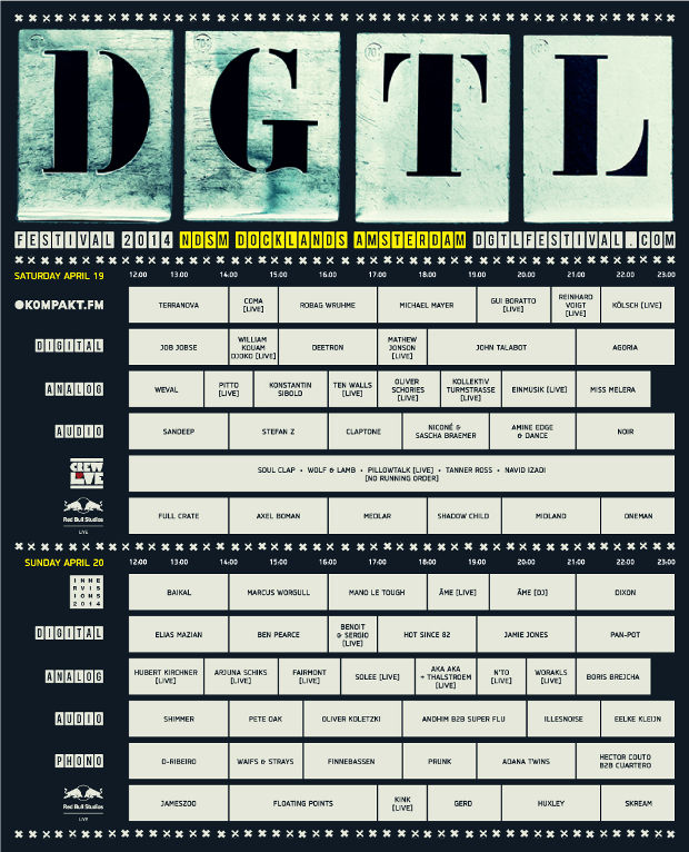 DGTL festival 2014: Het twee-daagse festival op de Amsterdamse NDSM-werf met namen als Gui Boratto, Pan-Pot, Dixon, Jamie Jones, Oliver Koletzki, Kölsch en Kollektiv Turmstrasse.